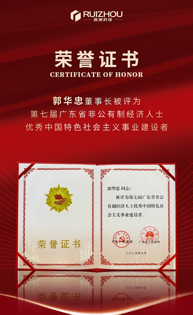 广东省非公有制经济人士优秀中国特色社会主义事业建设者” 称号,是省委、省政府对非公有制经济领域突出贡献者的重要褒奖,旨在表彰爱国敬业、守法经营、创业创新、回报社会的标杆人物。郭华忠此次获评,标志着其个人与瑞洲科技的发展路径、企业精神及社会价值,获社会各界高度认可。